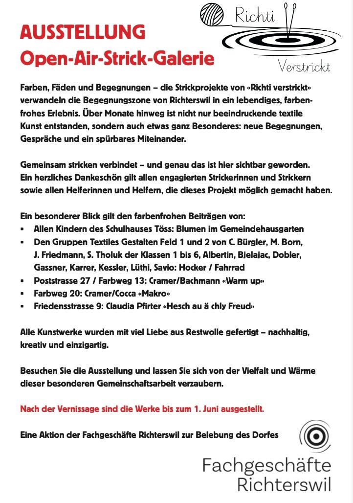 Hole dir Inspiration und erfahre an unserem Stand alles, was du über “Richti verstrickt” und die kommenden Strickaktionen wissen möchtest. Ab jetzt werden die Strickprojekte verteilt und zugeteilt. Mache mit und werde Teil unserer farbenfrohen Strickgemeinschaft! Auch Häkeln, Weben oder andere Techniken sind möglich, Hauptsache Bunt! Ein eigenes Projekt umsetzen? Sehr gerne, aber bitte mit Sabina di Nunzio (Rosa Träume) oder Claudia Tanner (Papeterie Köhler) abstimmen was, wie, wo…